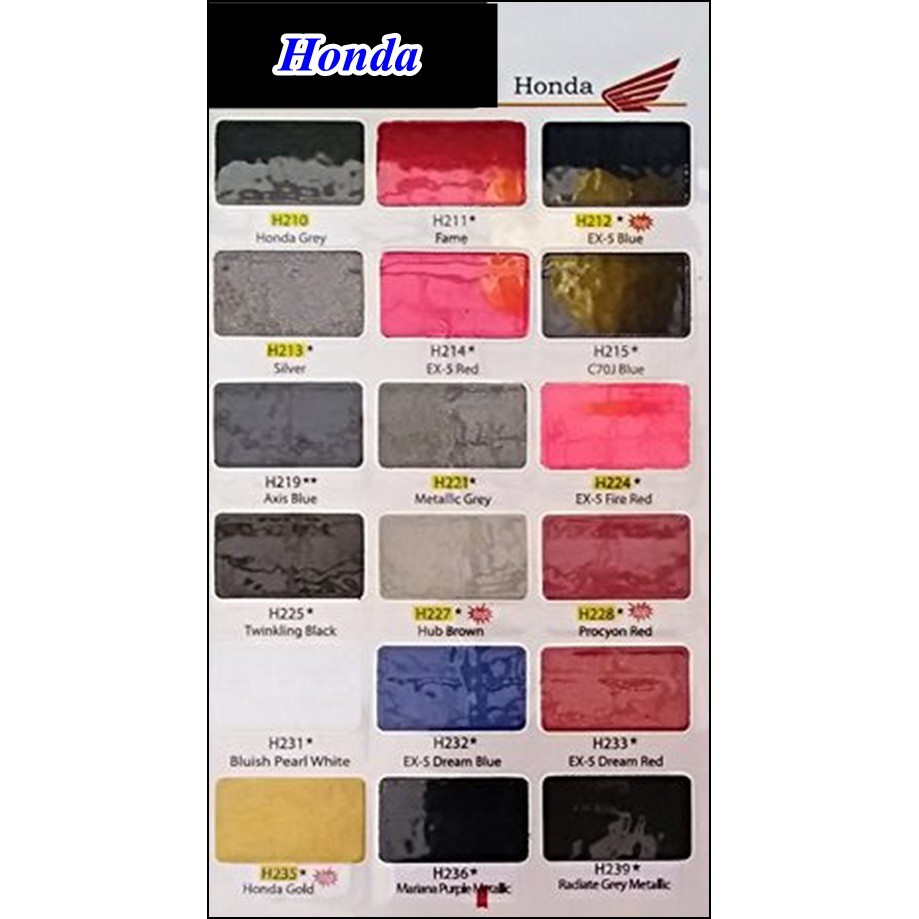 Samurai spray paint honda colour no h232 ex 5 dream blue. Please buy 100ml to confirm colour . Boss, saya mahu spray body ex5 colour hitam (ori colour). All honda motorcycles have a designated color code.